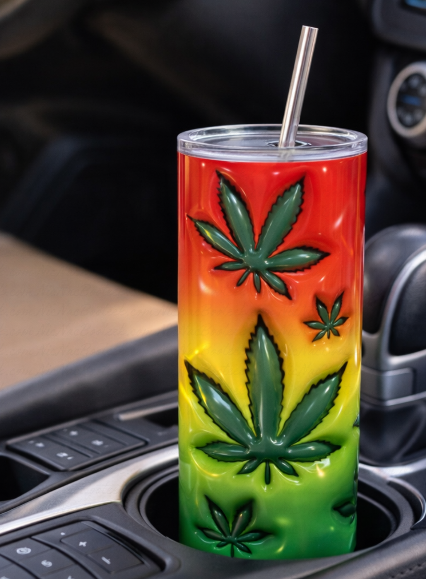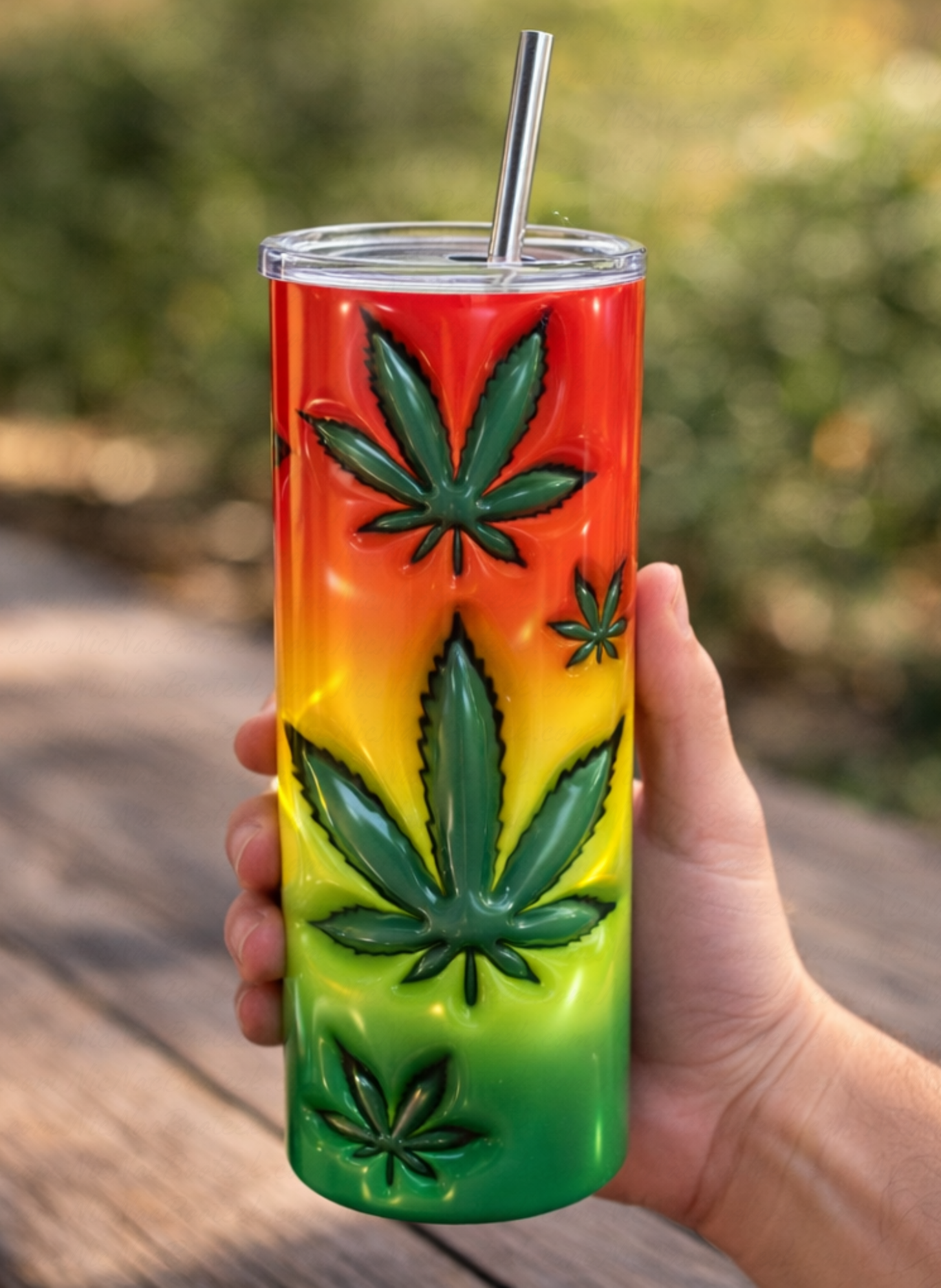 The NNB Rasta Leaf Luxe Tumbler delivers a striking visual experience with its smooth gradient blend of red, yellow, and green tones, layered with embossed-style cannabis leaf elements that add depth and dimension.